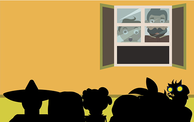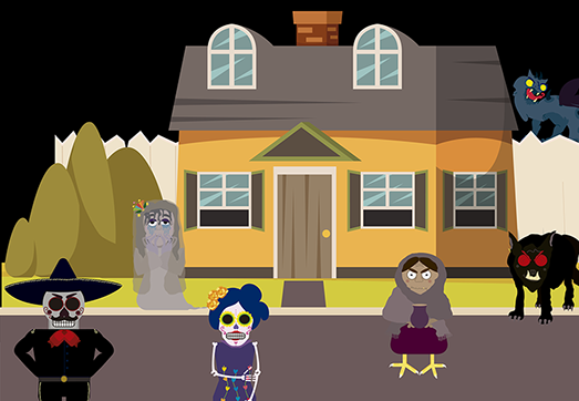 Como si fuera un desfile de espantajos, ¡los espectros de las leyendas de los abuelos estaban caminando en su calle! Encanijados por haber sido olvidados, seis enormes e imponentes figuras se acercaban a su jardín, un par de ojos grandes y traviesos volteo a verlos y pum! las luces se apagaron por completo, la puerta salió volando y en cuestión de segundos aquellos espectros habían desaparecido...
